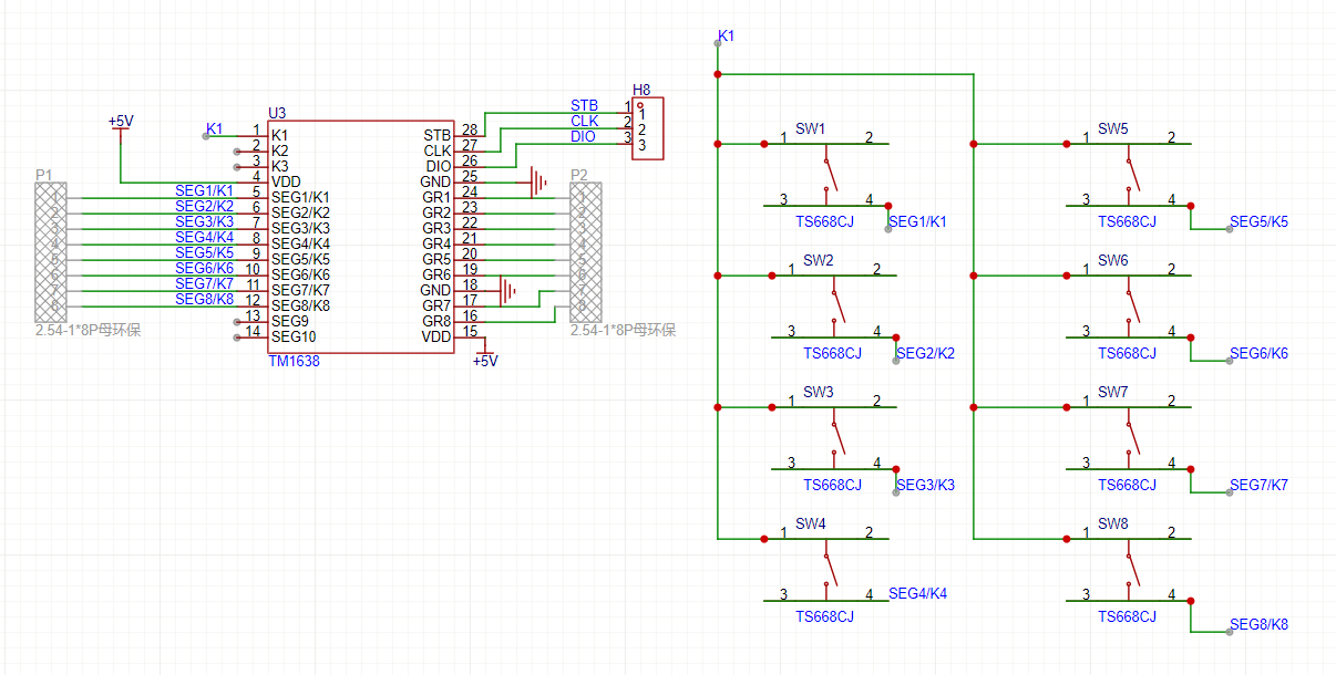 xiaobendan001 發表于 2025-10-3 17:33 發貼的時候有文字的,不知怎么沒有了,補一下: 電路如圖,接了8個按鍵,參考壇子里的代碼,按SW1、SW2、SW3、SW5、SW7時,數碼管可以累加計數。但不知如何得到鍵值,試驗了很多種方法都不行。 要求是按SW1、SW2時,能得到1、2或0x01、0x02就行。 |