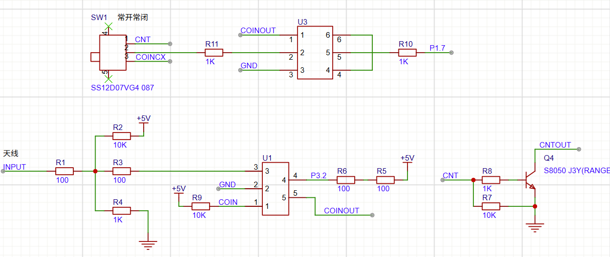 | 由于圖中沒有明確標注這兩個器件的型號,只能根據電路連接和你提供的信息進行推測,以下是對這兩個器件可能作用的分析: ### 5腳器件 從你的描述和電路連接來看,推測這個 5 腳器件很有可能是一個 **比較器** ,比如常見的LM393等型號的雙電壓比較器(雖然這里只用了其中一路) 。以下是具體的工作原理分析: - **輸入部分**: - **3腳(天線輸入)**:接收外界的高頻信號,經過前面電阻R1、R3等組成的分壓網絡,將輸入信號進行一定的處理后送到比較器的一個輸入端,這個信號可能代表著外界干擾或者電擊等信號的電平情況。 - **1腳(COIN,單片機脈沖信號)**:接單片機輸出的一個參考脈沖信號,用于和3腳輸入的信號進行比較。這個參考信號可以設定一個閾值,當3腳的輸入信號電平超過或低于該閾值時,比較器輸出狀態就會改變。 - **輸出部分**: - **5腳(輸出)**:根據1腳和3腳信號的比較結果輸出相應的電平信號,通過R6、R5等電阻連接到單片機的IO口(P3.2),將比較結果反饋給單片機,以便單片機進行后續的處理,比如判斷是否有高頻干擾或者電擊信號等 。 - **供電部分**:4腳連接到單片機的IO口且正常工作時為高電平,推測這個IO口是用于控制該比較器的供電,或者是設置比較器的某些工作模式 。比如,當IO口輸出高電平時,比較器正常工作;輸出低電平時,比較器進入低功耗或關閉狀態。 ### 6腳器件 結合CNT常態為0,有信號時給一個脈沖用于計數,COINCX一直保持高電平的信息,推測這個6腳器件可能是一個 **信號處理或轉換芯片** ,比如一些簡單的邏輯芯片(如74系列的邏輯門芯片 ),或者是專用的脈沖整形、隔離芯片等 ,以下是具體分析: - **CNT信號路徑**:CNT常態是0,有信號時產生一個脈沖,經過R11電阻連接到6腳器件的1腳,然后從6腳器件的5腳輸出,再經過R10連接到單片機的IO口(P1.7) 。推測這個6腳器件對CNT輸入的脈沖信號進行了處理,可能是進行了信號的整形、隔離或者電平轉換等操作,使得輸出的脈沖信號更適合單片機進行計數等處理 。 - **COINCX信號**:COINCX一直保持高電平,連接到6腳器件的3腳,可能是作為6腳器件內部邏輯判斷的一個參考電平,或者是用于控制6腳器件內部某些電路的工作狀態 。而2腳接地,為芯片提供了穩定的參考地電平。 要確切知道這兩個器件的功能,最好是查看電路板的設計文檔或者找到器件的絲印,根據絲印查找對應的器件手冊 。 |