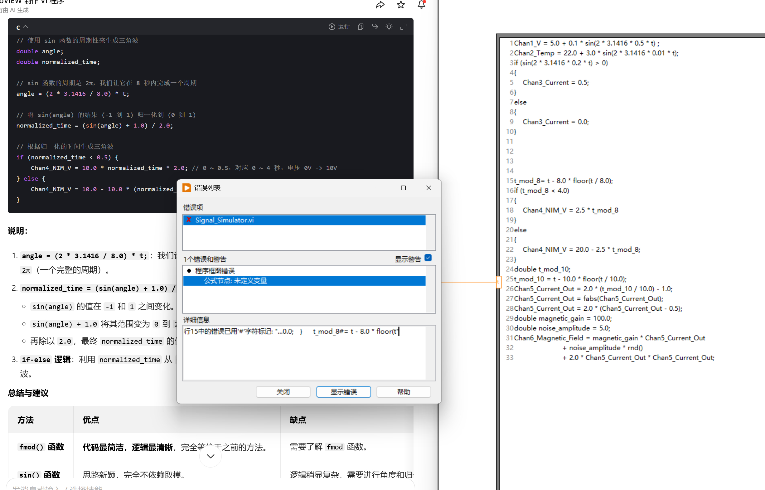 Chan1_V = 5.0 + 0.1 * sin(2 * 3.1416 * 0.5 * t) ; Chan2_Temp = 22.0 + 3.0 * sin(2 * 3.1416 * 0.01 * t); if (sin(2 * 3.1416 * 0.2 * t) > 0) { Chan3_Current = 0.5; } else { &nbs ...
