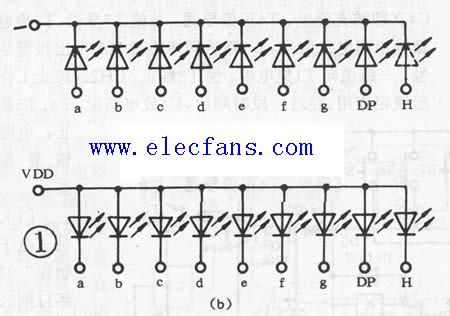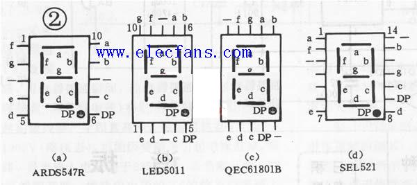 三、測(cè)試:同測(cè)試普通半導(dǎo)體二極管一樣。注意!萬用表應(yīng)放在R×10K檔,因?yàn)镽×1K檔測(cè)不出數(shù)碼管的正反向電阻值。對(duì)于共陰極的數(shù)碼管,紅表筆接數(shù)碼管的“-”,黑表筆分別接其他各腳。測(cè)共陽極的數(shù)碼管時(shí),黑表筆接數(shù)碼管的vDD,紅表筆接其他各腳。另一種測(cè)試法,用兩節(jié)一號(hào)電池串聯(lián),對(duì)于共陰極的數(shù)碼管,電池的負(fù)極接數(shù)碼管的“-”,電池的正極分別接其他各腳。對(duì)于共陽極的數(shù)碼管,電池的正極接數(shù)碼管的VDD,電池的負(fù)極分別接其他各腳,看各段是否點(diǎn)亮。對(duì)于不明型號(hào)不知管腳排列的數(shù)碼管,用第一種方法找到共用點(diǎn),用第二種方法測(cè)試出各筆段a-g、Dp、H等。