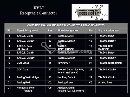 從針腳上可以看出,除了地線以外,DVI-I接口比DVI-D接口原架構(gòu)規(guī)范上,多了RGBHV這幾個(gè)與 VGA 定義一樣的信號(hào)線插腳。而這些多余出來(lái)的針腳就是DVI-A,兩者結(jié)合就構(gòu)成了DVI-I接口。