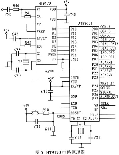 本系統主要采用AT89C5l作為核心。HT9170和HT9200A作為雙音多頻(DTMF)信號接收器和發生器,