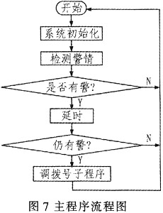 為使程序清晰可讀且運行速率高,本系統軟件采用模塊化結構設計,由主程序、中斷服務程序和相關子程序(如延時子程序、語音提示子程序、放音子程序、撥號子程序等)組成。其主程序流程圖如圖7所示。撥號報警子程序流程圖如圖8所示。