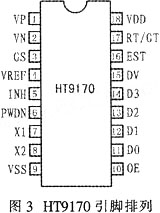 HT9170系列是集成了數字解碼器和多帶濾波器功能的雙音頻DTMF接收器,可工作在掉電模式和抑制模式下。HT9170系列器件都是采用數字化計算方法識別,將16倍的DTMF音頻解碼后轉化為4位代碼輸出。高精度的轉換電容濾波器將音頻DTMF信號分離為低頻信號和高頻信號,自帶撥號音頻阻波電路可省去前置濾波器所需的阻波電路。HT9170的引腳排列如圖3所示。