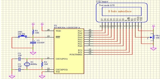 HT48R50A-1 的端口A接到字符型LCD的D0-D7(數據總線),使用字符型LCD的8位數據接口。