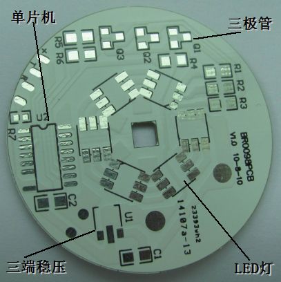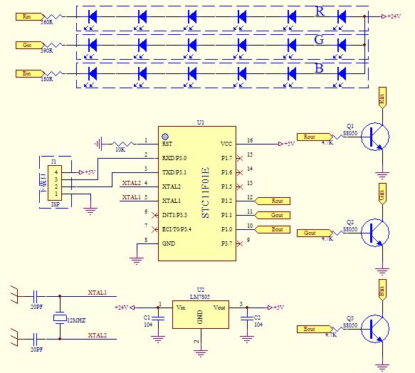 (采用5050LED 2W) RGB三色LED控制引腳分別為單片機P1.2 、 P1.1 、 P1.0。LED正極接主電源(24V)正極,負極接驅動3顆三極管的集電極,單片機控制腳分別接3顆NPN三極管,三極管發射極接地,而單片機的供電是來自三端穩壓器7805,祥細原理如下:
