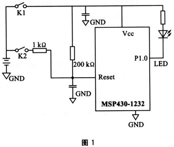 現(xiàn)今市面上流行的一些單片機(jī),多嵌有內(nèi)部WDT,如TI的MSP430系列,Philips的P87XXX和P89XXX系列,Microchip的PIC列,Atmel的AT89SXX系列和Holtek公司的Htxxx系列。但是這些內(nèi)部看門狗在工作時(shí),多存在一定的誤差。一些工程師在設(shè)計(jì)的過(guò)程中,由于忽略了這一點(diǎn),導(dǎo)致系統(tǒng)出現(xiàn)異常。MSP430系列單片機(jī)是美國(guó)德州儀器公司(TI)近幾年開(kāi)發(fā)的新一代單片機(jī),該系列是一款16位、具有精簡(jiǎn)指令集、超低功耗的全新概念混合型單片機(jī)。在眾多單片機(jī)系列中,由于它具有極低的功耗、豐富的片內(nèi)外設(shè)和方便靈活的開(kāi)發(fā)手段,已成為一顆耀眼的新星。其內(nèi)部自帶看門狗及復(fù)位電路,理論上如果程序跑飛,可用看門狗將其復(fù)位。但在實(shí)際使用過(guò)程中,發(fā)現(xiàn)看門狗的作用并非萬(wàn)無(wú)一失,以下實(shí)驗(yàn)證明了這一點(diǎn)。實(shí)驗(yàn)電路如圖1所示。