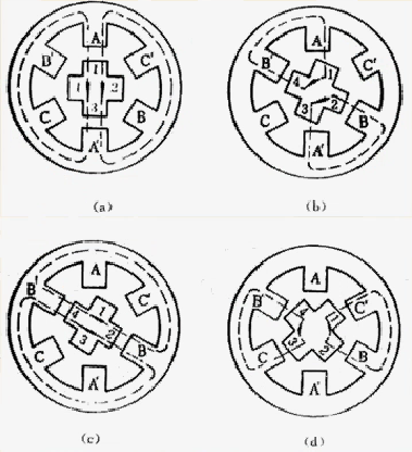 當A相通電時,產生A-A1軸線方向的磁通,并通過轉子形成閉合回路。這時候A、A1就成了電磁鐵的N、S極。在磁場的作用下,轉子總是力圖轉到磁阻最小的位置,也就是要轉到轉子的齒對齊A、A1極的位置,也就是說轉子的1、3會對著定子的A、A1(圖a);