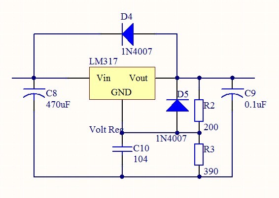 這是LM317三端穩壓電路,輸出3.7v,用來給手機供電。手機長時間直接使用5v會燒壞。另外,要在手機正負極并聯一個1000uf的電容。因為手機接受發射信號的時候電流峰值能達到2A