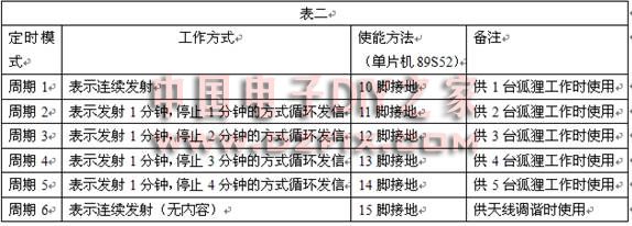 單片機10~15腳用于選擇發報定時周期,它們的工作方式共有六種,詳見表二: