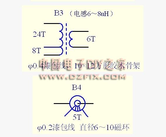 電感制作向來是讓人頭疼的事情,不過只要你足夠認真細致,你就會覺得并沒有想象中那么困難。當然,在動手前最好準備個簡易電感計,這樣可以對自制線圈的電感量有個正確的把握,好在現在有很多廉價實用的電感測試工具,我們就是利用一個由HAM自己開發制作的簡易電感電容表來測量線圈電感值。L1、L2、 L2是在一個3W 1.5M的電阻體上用直徑0.3mm左右的漆包線亂繞120圈左右,漆包線兩端焊在電阻的兩端引線上,它是作為高頻阻流線圈來使用的。B1和它的諧振電容配合諧振在3.55MHz中心頻率上,以便從振蕩級取得最大幅度的輸出信號。當該電容取220P時,根據公式f=1/√LC,計算B1的電感量應該為 9.12uH. B1線圈可以去家電維修配件店買幾個3070型10×10電視中周,拆除原線圈只利用它的骨架,初級用0.3左右漆包線在骨架的四個槽上同方向各繞7圈共計28圈,裝回中周磁罩和罩殼,當磁芯從罩殼平齊狀態往外調時電感量范圍有12uH~6uH變化,只要覆蓋了理論電感值9.12uH就算符合我們的要求了。B1次級則在中間2槽同向各繞4圈共8圈。B2的骨架也是采用10×10電視中周,型號為1445.同理,如果B2和300P的諧振電容配合要求諧振在3.55MHz的話,根據公式計算中心電感量應該為6.68uH.參照B1做法,B2的初級是在膠木骨架上用直徑0.2毫米左右的漆包線均勻繞上44 圈,次級則是在初級線圈上面繞上10圈。線圈繞完后測量初級電感,在磁芯進出變化時,電感量會在5uH~10uH之間變化就符合我們的期望了。B3使用的骨架是采用開關電源變壓器上使用的截面為10×12方形膠木骨架,初級用直徑0.4毫米左右的漆包線均勻繞上32圈,并在8圈數時作個抽頭,測初級的電感量應為6.8uH左右,次級則在初級上面均勻繞上6圈。B4隨便找個直徑6~10毫米的磁環次級用0.4毫米的漆包線繞或單股網線上5圈,初級則直接讓射頻輸出線穿越通過。B5是個天線底部加感線圈采用和B3相同的骨架,用0.4毫米漆包線繞在上面,第一個抽頭為35圈,以后每繞15圈做個抽頭,共計90 圈,在骨架芯中用熱膠粘入一個直徑6毫米長10毫米的磁芯以增加它的電感量,B5和一種12檔的旋轉切換開關配合用來選擇和天線最佳搭配的電感量。業余條件下線圈的制作可以不拘骨架形式和線徑規格,只要大概符合要求就行,但諧振回路的電感量則需要精確控制的,如果電感量不符合要求,可以自行通過增減線圈的圈數來調節。