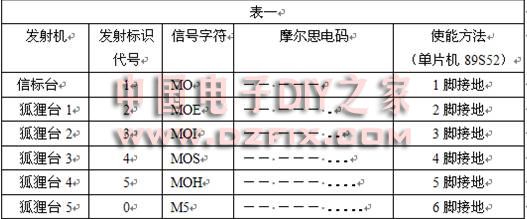制作前參閱了各類資料,確定了電路的方案,經細化后形成現在這個了線路。電路大體上是由晶體振蕩級、緩沖放大級、推動級、射頻功放級和單片機發報控制電路所組成。由3.579M晶體和T1組成的振蕩級是個典型的電容三點式振蕩電路,它的輸出頻率完全取決于晶體頻率,所以你不用擔心頻率會有什么偏移。之所以選擇3.579MHz頻率晶體,一是因為這個頻率是在測向規定頻率范圍(80米測向頻率規定在3.5MHz~3.6MHz之間);二這個晶體是市場比較容易買到的。T2是個射極輸出形式的電路,它用來放大B1輸出的射頻信號,以便提高驅動T3的能力。T3則是用作射頻功放前的推動部分,它的供電端(B2的上端)是受T4控制的,而T4的導通與否又是由光耦521所決定的,但真正的控制源頭還是來自于單片機89S52第17腳。單片機可以根據測向信號所需的節奏,通過控制T3的供電來影響射頻的輸出。射頻經過T3放大進入B2選頻后由次級輸出。T4是個典型的丙類放大電路,由于無信號時晶體管處于截至狀態,因此你不必擔心它靜態時的耗電。B4是讀取向外輻射高頻電流用的,它和表頭A配合能使你直觀了解天線向外的輻射情況。之后,射頻進入天線,B5是天線的底部電感線圈,它可以使天線和功放獲得合理匹配,使得天線最大限度地向外輻射能量。單片機內部則根據測向規則,寫入了測向所需的控制信號。其中1~6腳分別接地后可以選擇發報內容,它們的內容見表一: