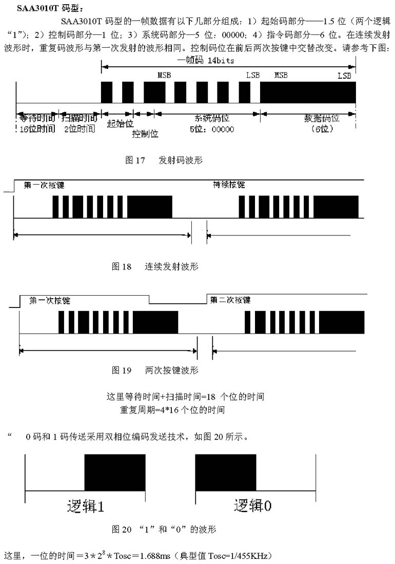 遙控發射器專用芯片很多,根據編碼格式可以分成兩大類,這里我們以運用比較廣泛,解碼比較容易的一類來加以說明,現以SAA3010T組成發射電路為例說明編碼原理。當發射器按鍵按下后,即有遙控碼發出,所按的鍵不同遙控編碼也不同。