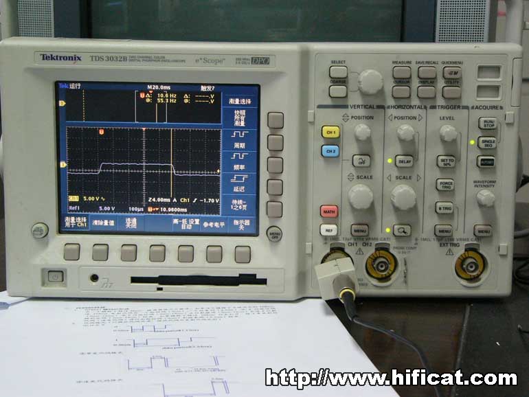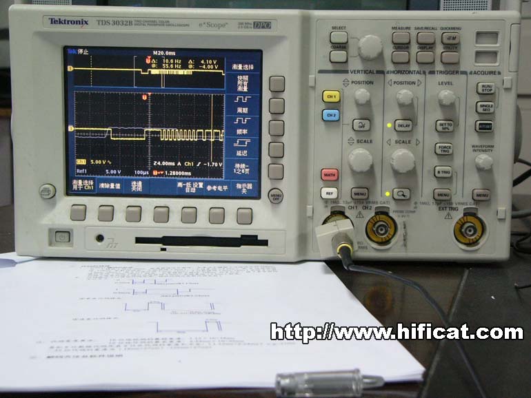 以下是用數字示波器來察看紅外線遙控器波形的過程圖。與傳統的示波器不同,數字示波器可以記錄下一定時間內的波形變化,因此,用來分析紅外線編碼非常方便。