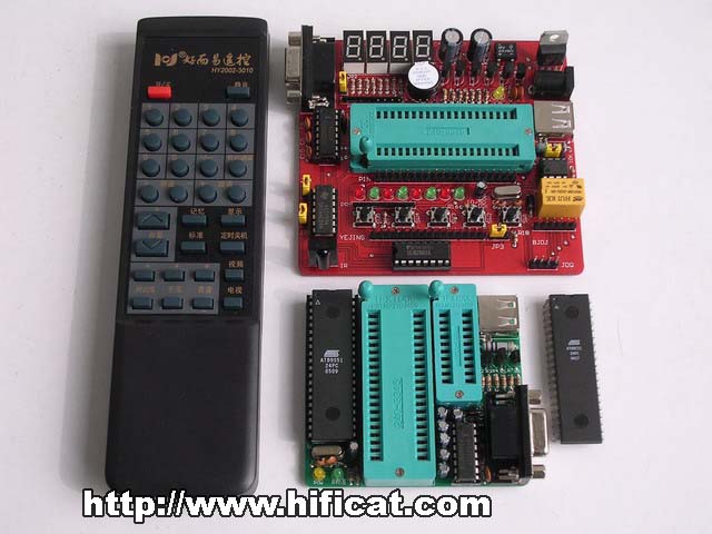 下圖所示是我們將要進行紅外線解碼實驗所要用到的增強型51實驗板、A51編程器、AT89S51單片機芯片和紅外線遙控器(SAA3010T編碼芯片)