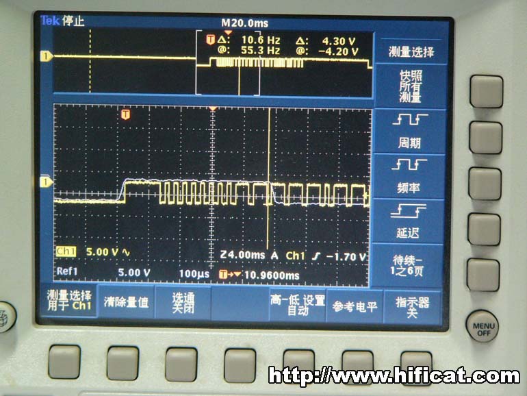 按紅外線遙控器上的按鈕,可以看到示波器屏幕上出現脈沖波形。在此,站長要特別說明一點,紅外線遙控器的發射和接收端的電平狀態為反相的關系,即發射是“1”的話,則接收端的數據為“0”。