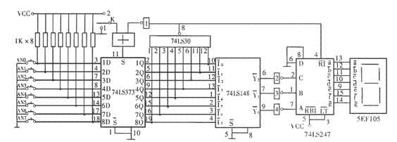 本八路搶答器設計使用方法非常簡單,從上述工作原理可知,搶答前只需先將開關K置于2,然后再置于1,即可進行搶答 . 順便提一下,由于當按鈕開關AN0先按下時,數碼管顯示0,這與我們平時的編號習慣有點不同。本八路搶答器論文中關于原理的分析內容均為http://m.izizhuan.cn單片機教程網,工作人員得出如有錯誤請指正。本設計元件選擇:鎖存器選用74ls373 八路鎖存器,編碼器用 74ls148 三線編碼器,數碼顯示驅動器用bcd碼七段譯碼器74ls247與共陽極七段數碼管搭配,控制電路由八輸入與非門 74ls30和一個或門、一個非門構成,或門用74ls32二輸入四或門,非門 74ls04六反相器。