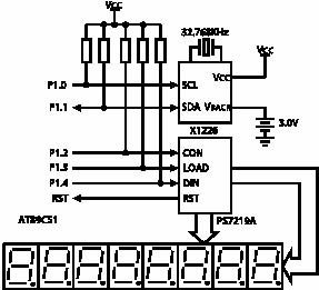 為了更直觀地看到時間的變化,采用8位LED數(shù)碼管顯示年、月、日或時、分、秒,用PS7219A驅(qū)動LED數(shù)碼管,數(shù)碼管選擇0.5英寸共陰極紅色或綠色LED數(shù)碼管。由于PS7219A器件內(nèi)含IMP810單片機(jī)監(jiān)控器件,復(fù)位輸出高電平有效,因此在使用51系統(tǒng)時,無須添加監(jiān)控器件,使用PS7219A的復(fù)位輸出給51單片機(jī)復(fù)位即可,監(jiān)控電壓為4.63V。硬件設(shè)計原理圖如圖1所示。