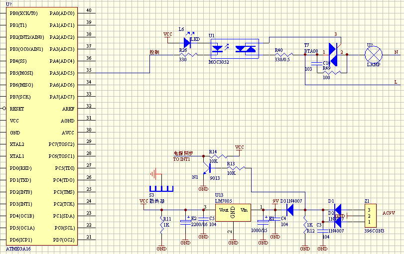 同步信號輸入--下沿中斷寫計數初值,開始計數--計數器溢出中斷,判標志=0,打開可控硅,寫觸發脈沖初值,寫標志=1---再次溢出中斷,判標志=1,關可控硅,清零標志--------再次同步中斷,51的代碼我這里就不貼出來了,需要者可聯系我手機15886684881,QQ號碼是125739409加入時請注明"調光"哦