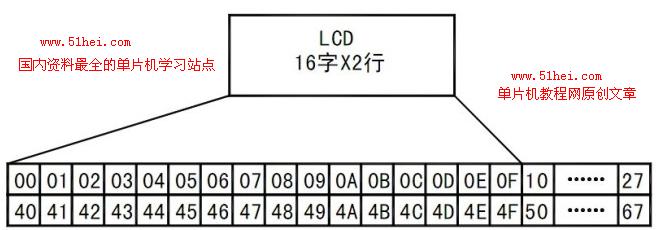 LCD1602內(nèi)部RAM顯示緩沖區(qū)地址的映射圖,00~0F、40~4F分別對(duì)應(yīng)LCD1602的上下兩行的每一個(gè)字符,只要往對(duì)應(yīng)的RAM地址寫入要顯示字符的ASCII代碼,就可以顯示出來(lái)。