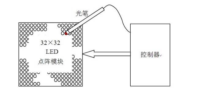 設計并制作一個基于32×32點陣LED模塊的書寫顯示屏,其系統結構如圖1所示。在控制器的管理下,LED點陣模塊顯示屏工作在人眼不易覺察的掃描微亮和人眼可見的顯示點亮模式下;當光筆觸及LED點陣模塊表面時,先由光筆檢測觸及位置處LED點的掃描微亮以獲取其行列坐標,再依據功能需求決定該坐標處的LED是否點亮至人眼可見的顯示狀態(如圖1中光筆接觸處的深色LED點已被點亮),從而在屏上實現“點亮、劃亮、反顯、整屏擦除、筆畫擦除、連寫多字、對象拖移”等書寫顯示功能。