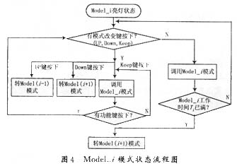 主程序除了調用各種子模式子程序(Model_i),調用LED顯示子程序(Display)和延時子程序(Delay)之外,還一直保持查詢是否有功能切鍵按下以及是否有模式改變按鍵按下,一旦有功能切換鍵和模式改變鍵按下,就會進入相應的按鍵處理。? 主程序流程如圖3所示。亮燈模式子程序Model_i可以編寫若干(n種),只要控制好各色燈觸發和熄滅時刻就可以組合成各種亮燈效果。Model_i程序流程如圖4所示。