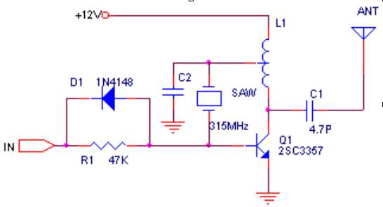 與晶振電路相比,聲表振蕩電路簡單多了。圖1電路為常見的發射機電路,由于使用了聲表器件,電路工作非常穩定,即使手抓天線、聲表器或電路其他部位,發射頻率均不會漂移。本電路有效傳輸距離可達200米以上。