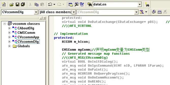 然后找到對話框 類的定義代碼中加入CMSComm類變量聲明
