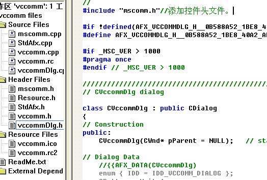 再在對話框的頭文件集中的×××Dlg.h(×××是你的文件名)的最開頭添加mscomm頭文件#include "mscomm.h"(如下圖)