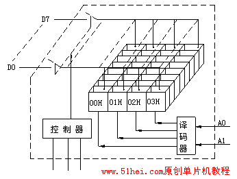 讓我們看圖2。單片機里面都有這樣的存儲器,這是一個存儲器的示意圖:一個存儲器就象一個個的小抽屜,一個小抽屜里有八個小格子,每個小格子就是用來存放“電荷”的,電荷通過與它相連的電線傳進來或釋放掉,至于電荷在小格子里是怎樣存的,就不用我們操心了,你能把電線想象成水管,小格子里的電荷就象是水,那就好理解了。存儲器中的每個小抽屜就是一個放數據的地方,我們稱之為一個“單元”。
