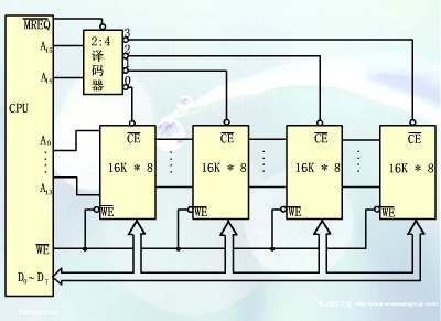 那么,我們怎樣來控制各個單元的控制線呢?這個還不簡單,把每個單元元的控制線都引到集成電路的外面不就行了嗎?事情可沒那么簡單,一片27512存儲器中有65536個單元,把每根線都引出來,這個集成電路就得有6萬多個腳?不行,怎么辦?要想法減少線的數量。我們有一種辦法稱這為譯碼,簡單介紹一下:一根線能代表2種狀態,2根線能代表4種狀態,3根線能代表幾種,256種狀態又需要幾根線代表?8種,8根線,所以65536種狀態我們只需要16根線就能代表了。