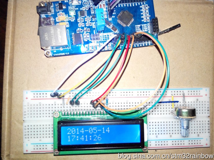 這個程序使用了1602的LCD作為時鐘顯示,程序首先通過DHCP獲取到網絡參數,如果獲取成功,則調用HardwareRTC類的syncNetworkTime()方法,從NTP服務器同步時間戳到Rainbow,在之后的程序運行中,每隔1秒對LCD上的時間進行一次更新。下圖是程序運行的效果: