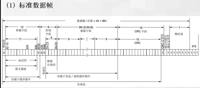 第二個是仲裁段,11位的ID,注意這里的ID并不是地址,而是發送優先級,這和IIC是不一樣的,正因為如此,所以理論上CAN總線上能掛無數個器件。