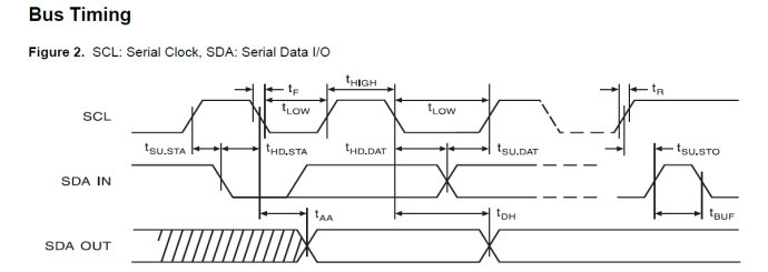 其中起始信號(hào):在SCL為高電平時(shí),SDA電平由高變低,且高電平SDA高電平持續(xù)時(shí)間要大于4.7us,在SCL由高電平變低時(shí),SDA的低電平持續(xù)時(shí)間要大于4us