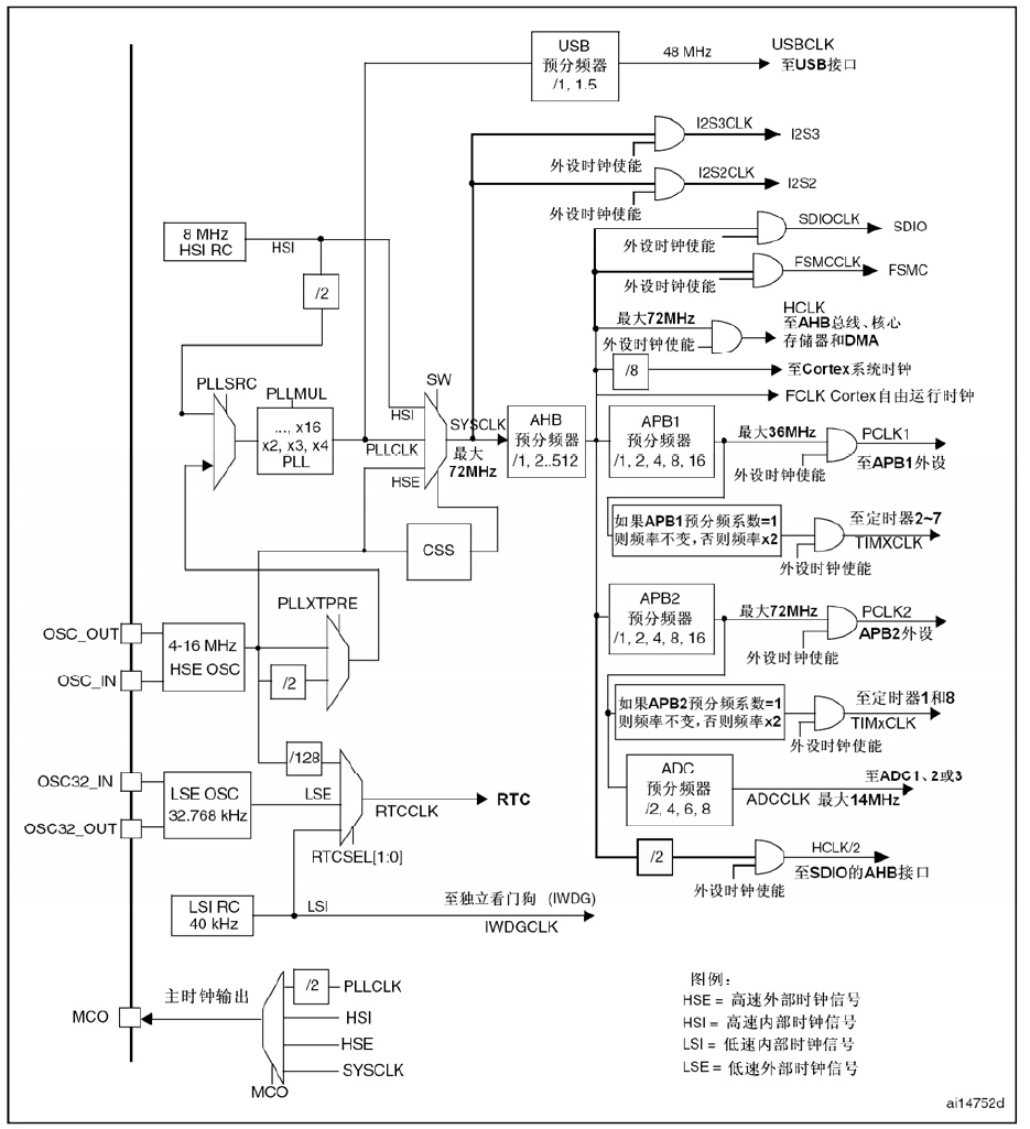 2.用戶可通過多個預分頻器配置AHB、高速APB(APB2)和低速APB(APB1)域的頻率。AHB和APB2域的最大頻率是72MHz。APB1域的最大允許頻率是36MHz。SDIO接口的時鐘頻率固定為HCLK/2。