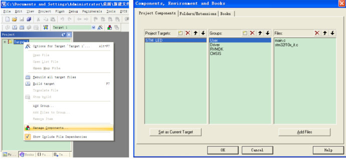 2.在 Target 1 點擊鼠標右鍵,在點擊 Manager Components…,在 Project Tragets