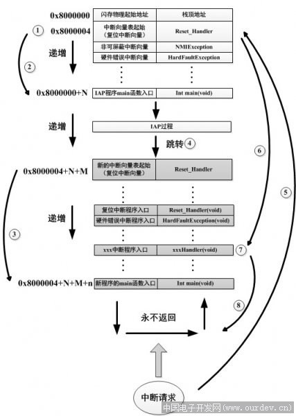 2、 執(zhí)行完IAP過(guò)程后(STM32內(nèi)部多出了新寫(xiě)入的程序,圖2中以灰色底紋方格表示,地址始于0x8000004+N+M)跳轉(zhuǎn)至新寫(xiě)入程序的復(fù)位向量表,取出新程序的復(fù)位中斷向量的地址,并跳轉(zhuǎn)執(zhí)行新程序的復(fù)位中斷服務(wù)程序,隨后跳轉(zhuǎn)至新程序的main函數(shù),其過(guò)程如圖2的標(biāo)號(hào)○3所示。新程序的main函數(shù)應(yīng)該也具有永不返回的特性。同時(shí)應(yīng)該注意在STM32的內(nèi)部存儲(chǔ)空間在不同的位置上出現(xiàn)了2個(gè)中斷向量表。