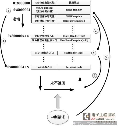 3、 在main函數(shù)執(zhí)行的過(guò)程中,發(fā)生了一個(gè)中斷請(qǐng)求,此時(shí)STM32的硬件機(jī)制會(huì)將PC指針強(qiáng)制指回中斷向量表處,如圖1中標(biāo)號(hào)○3所示。