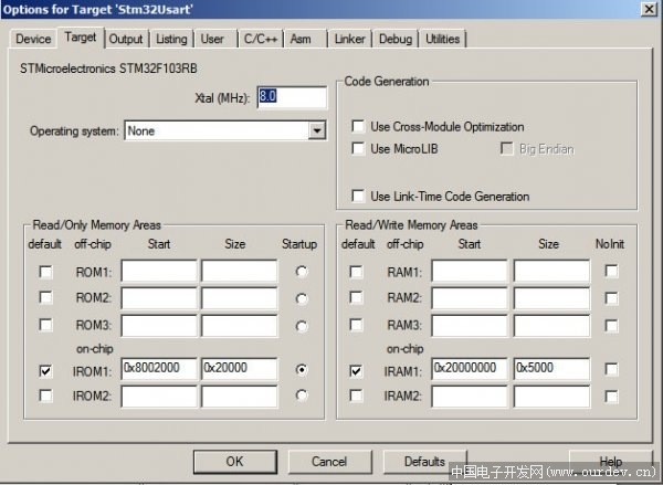 而設(shè)置程序起始位置的方法是(keil uvision4集成開(kāi)發(fā)環(huán)境)在工程的“Option for Target….”界面中的“Target”頁(yè)里將“IROM”的“Start”列改為欲使程序起始的地方,如圖3中將程序起始位置設(shè)為0x8002000。